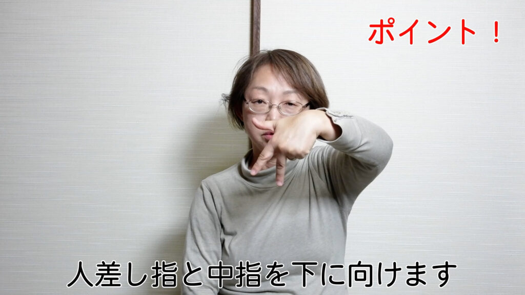 親指・人差し指・中指を出し、人差し指と中指を下に向けます